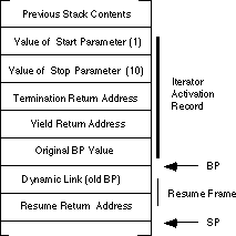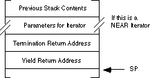 To begin with, an iterator will require two return addresses rather than the single return address you would normally expect. The first return address appearing on the stack is the termination return address. The second return address is where the subroutine transfers control on a yield operation. The calling code must push these two return addresses upon initial invocation of the iterator. The stack, upon initial entry into the iterator, should look something like this: