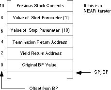 Although this routine is rather short, don't let its size deceive you; it's quite complex. The best way to describe how this iterator operates is to take it a few instructions at a time. The first two instructions are the standard entry sequence for a procedure. Upon execution of these two instructions, the stack looks like: