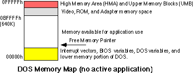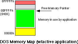 DOS maintains a free memory pointer that points the the beginning of the block of free memory. When the user runs an application program, DOS loads this application starting at the address the free memory pointer contains. Since DOS generally runs only a single application at a time, all the memory from the free memory pointer to the end of RAM (0BFFFFh) is available for the application's use: