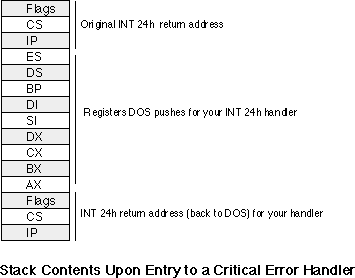 To intercept DOS critical errors, you will need to patch the interrupt 24h vector to point at your own interrupt service routine. Upon entry into your interrupt 24h service routine, the stack will contain the following data: