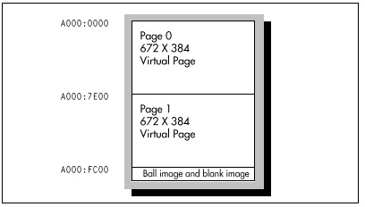 The logical width of the virtual screen is defined by the Offset register (CRTC register 13H), which allows redefinition of the number of words of display memory considered to make up one scan line. Normally, 40 words of display memory constitute a scan line; after the CRTC scans these 40 words for 640 pixels worth of data, it advances 40 words from the start of that scan line to find the start of the next scan line in memory. This means that displayed scan lines are contiguous in memory. However, the Offset register can be set so that scan lines are logically wider (or narrower, for that matter) than their displayed width. The sample program sets the Offset register to 2AH, making the logical width of the virtual screen 42 words, or 42 * 2 * 8 = 672 pixels, as contrasted with the actual width of the mode 10h screen, 40 words or 640 pixels. The logical height of the virtual screen in the sample program is 384; this is accomplished simply by reserving 84 * 384 contiguous bytes of VGA memory for the virtual screen, where 84 is the virtual screen width in bytes and 384 is the virtual screen height in scan lines.