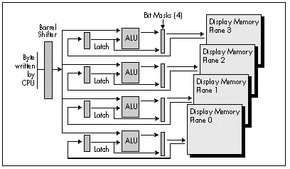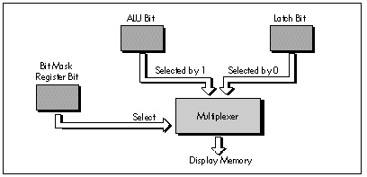 The bit mask is controlled by GC register 8, the Bit Mask register. If a given bit of the Bit Mask register is 1, then the corresponding bit of data from the ALUs is written to display memory for all four planes, while if that bit is 0, then the corresponding bit of data from the latches for the four planes is written to display memory unchanged. (In write mode 3, the actual bit mask thats applied to data written to display memory is the logical AND of the contents of the Bit Mask register and the data written by the CPU, as well see in Chapter 26.)