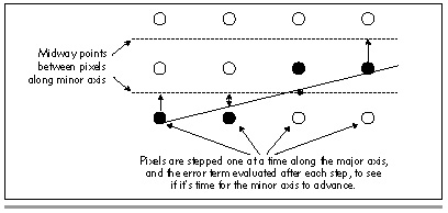 The place to begin understanding the run-length slice algorithm is the standard Bresenhams line-drawing algorithm. (I discussed the standard Bresenhams line-drawing algorithm at length in the previous chapter.) The basis of the standard approach is stepping one pixel at a time along the major axis (the longer dimension of the line), while maintaining an integer error term that indicates at each major-axis step how close the line is to advancing halfway to the next pixel along the minor axis. Figure 36.1 illustrates standard Bresenhams line drawing. The key point here is that a calculation and a test are performed once for each step along the major axis.