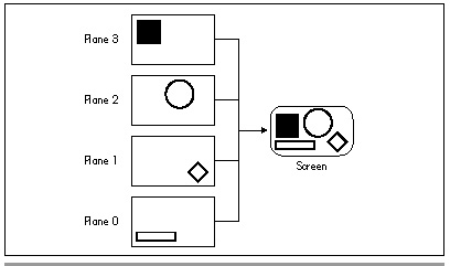 Take a good look at Figure 43.1. Any light bulbs going on over your head yet? If not, consider this. The general problem with VGA animation is that its complex and time-consuming to manipulate images that span the four planes (as most do), and that its hard to avoid interference problems when images intersect, since those images share the same bits in display memory. Since the four bit planes can be written to and read from independently, it should be apparent that if we could come up with a way to display images from each plane independently of whatever images are stored in the other planes, we would have four sets of images that we could manipulate very easily. There would be no interference effects between images in different planes, because images in one plane wouldnt share bits with images in another plane. Whats more, since all the bits for a given image would reside in a single plane, we could do away with the cumbersome programming of the VGAs complex hardware that is needed to manipulate images that span multiple planes.