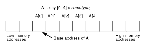 The base address of an array is the address of the first element on the array and always appears in the lowest memory location. The second array element directly follows the first in memory, the third element follows the second, etc. Note that there is no requirement that the indices start at zero. They may start with any number as long as they are contiguous. However, for the purposes of discussion, it's easier to discuss accessing array elements if the first index is zero. This text generally begins most arrays at index zero unless there is a good reason to do otherwise. However, this is for consistency only. There is no efficiency benefit one way or another to starting the array index at zero.