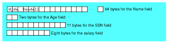 In this particular record format the age field starts at offset 14 in the record (since the name field and the "end of field" marker [the zero byte] consume 14 bytes). If a different name were chosen, then the age field would begin at a different offset in the record. In order to locate the age, ssn, and salary fields of this record, the program would have to scan past the name and find the zero terminating byte. The remaining fields would follow at fixed offsets from the zero terminating byte. As you can see, it's a bit more work to process this variable-length record than the fixed-length record. Once again, this demonstrates the performance difference between random access (fixed-length) and sequential access (variable length, in this case) files.