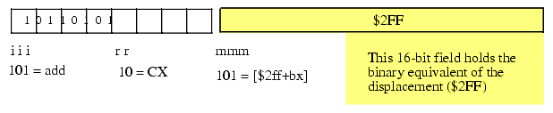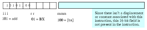 The last addressing mode to consider is the register indirect addressing mode, [bx]. The "add( [bx], bx );" instruction uses the following encoded values: mmm=%101, rr=%01 (bx), and mmm=%100 ([bx]). Since the value in the BX register completely specifies the memory address, there is no need for a displacement field. Hence, this instruction is only one byte long.