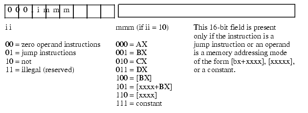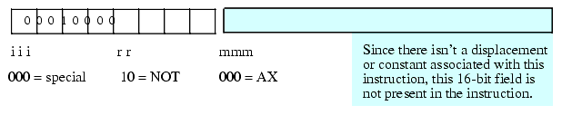 To encode an instruction like "not( ax );" you would simply specify %000 for iii and %10 for the rr fields. Then you would encode the mmm field the same way you would encode this field for the ADD instruction. Since mmm=%000 for AX, the encoding of "not( ax );" would be %00010000 or $10.