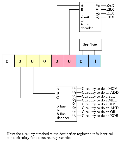 For example, if we really have only eight instructions, each instruction has two operands, and each operand can be one of four different values, then we can encode the opcode as three packed fields containing three, two, and two bits (see Figure 5.1). This encoding only requires the use of three simple decoders to completely determine what instruction the CPU should execute. While this is a bit of a trivial case, it does demonstrate one very important facet of instruction set design - it is important to make opcodes easy to decode and the easiest way to do this is to break up the opcode into several different bit fields, each field contributing part of the information necessary to execute the full instruction. The smaller these bit fields, the easier it will be for the hardware to decode and execute them2.