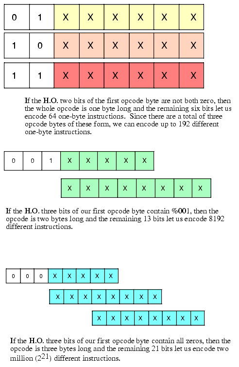 Before discussing how to use longer instructions to generate shorter programs, a short digression is necessary. The first thing to note is that we generally cannot choose an arbitrary number of bits for our opcode length. Assuming that our CPU is capable of reading bytes from memory, the opcode will probably have to be some even multiple of eight bits long. If the CPU is not capable of reading bytes from memory (e.g., most RISC CPUs only read memory in 32 or 64 bit chunks) then the opcode is going to be the same size as the smallest object the CPU can read from memory at one time (e.g., 32 bits on a typical RISC chip). Any attempt to shrink the opcode size below this data bus enforced lower limit is futile. Since we're discussing the 80x86 architecture in this text, we'll work with opcodes that must be an even multiple of eight bits long.