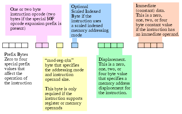 The prefix bytes are not the "opcode expansion prefix" that the previous sections in this chapter discussed. Instead, these are special bytes to modify the behavior of existing instructions (rather than define new instructions). We'll take a look at a couple of these prefix bytes in a little bit, others we'll leave for discussion in later chapters. The 80x86 certainly supports more than four prefix values, however, an instruction may have a maximum of four prefix bytes attached to it. Also note that the behavior of many prefix bytes are mutually exclusive and the results are undefined if you put a pair of mutually exclusive prefix bytes in front of an instruction.