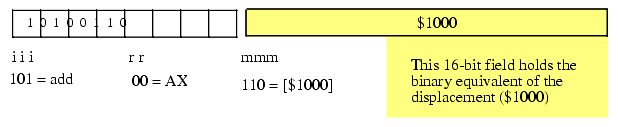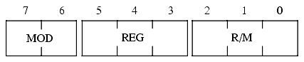 The MOD and R/M fields combine to specify the other operand in a two-operand instruction (or the only operand in a single-operand instruction like NOT or NEG). Remember, the "d" bit in the opcode determines which operand is the source and which is the destination. The MOD and R/M fields together specify the following addressing modes: