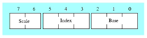 Another thing you'll notice missing from this table are addressing modes of the form [ebx+edx*4], the so-called scaled indexed addressing modes. You'll also notice that the table is missing addressing modes of the form [esp], [esp+disp8], and [esp+disp32]. In the slots where you would normally expect these addressing modes you'll find the SIB (scaled index byte) modes. If these values appear in the MOD and R/M fields then the addressing mode is a scaled indexed addressing mode with a second byte (the SIB byte) following the MOD-REG-R/M byte that specifies the registers to use (note that the MOD field still specifies the displacement size of zero, one, or four bytes). The following diagram shows the layout of this SIB byte and the following tables explain the values for each field.