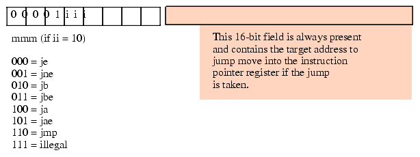 The Y86 conditional jump instructions also use a special encoding. These instructions are always three bytes long. The first byte (the opcode) specifies which conditional jump instruction to execute and the next two bytes specify where the CPU transfers if the condition is met. There are seven different Y86 jump instructions, six conditional jumps and one unconditional jump. These instructions set mmm=%000, rr=%01, and use the mmm field to select one of the seven possible jumps; the eighth possible opcode is an illegal opcode (see Figure 5.6). Encoding these instructions is relatively straight-forward. Once you pick the instruction you want to encode, you've determined the opcode (since there is a single opcode for each instruction). The opcode values fall in the range $08..$0E ($0F is the illegal opcode).