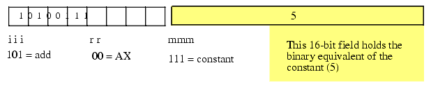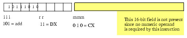 The first step is to chose an instruction to convert into machine code. We'll start with a very simple example, the "add( cx, dx );" instruction. Once you've chosen the instruction, you look up the instruction in one of the figures of the previous section. The ADD instruction is in the first group (see Figure 5.3) and has an iii field of %101. The source operand is CX, so the mmm field is %010 and the destination operand is DX so the rr field is %11. Merging these bits produces the opcode %10111010 or $BA.