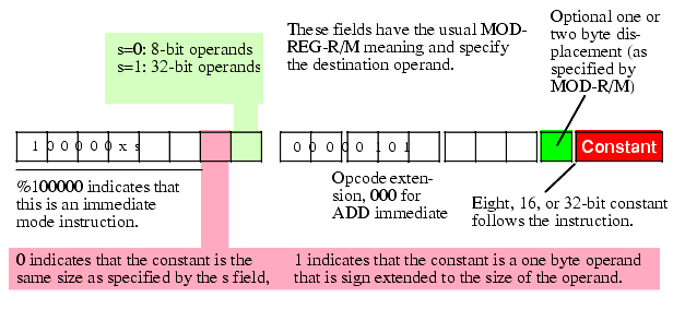 In place of the direction bit, the opcode has a sign extension (x) bit. For eight-bit operands, the CPU ignores this bit. For 16-bit and 32-bit operands, this bit specifies the size of the constant following the ADD instruction. If this bit contains zero then the constant is the same size as the operand (i.e., 16 or 32 bits). If this bit contains one then the constant is a signed eight-bit value and the CPU sign extends this value to the appropriate size before adding it to the operand. This little trick often makes programs quite a bit shorter because one commonly adds small valued constants to 16 or 32 bit operands.