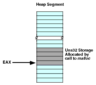 malloc( Number_of_Bytes_Requested );The single parameter is a dword value (an unsigned constant) specifying the number of bytes of storage you are requesting. This procedure allocate storages in the heap segment in memory. The HLA malloc function locates an unused block of memory of the specified size in the heap segment and marks the block as "in use" so that future calls to malloc will not reallocate this same storage. After marking the block as "in use" the malloc routine returns a pointer to the first byte of this storage in the EAX register.