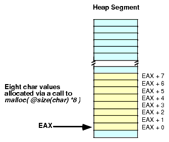 The examples thus far in this section have all allocated storage for a single unsigned 32-bit object. Obviously you can allocate storage for any data type using a call to malloc by simply specifying the size of that object as malloc's parameter. It is also possible to allocate storage for a sequence of contiguous objects in memory when calling malloc. For example, the following code will allocate storage for a sequence of 8 characters: