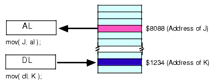 The most common addressing mode, and the one that's easiest to understand, is the displacement-only (or direct) addressing mode. The displacement-only addressing mode consists of a 32 bit constant that specifies the address of the target location. Assuming that variable J is an int8 variable allocated at address $8088, the instruction "mov( J, al );" loads the AL register with a copy of the byte at memory location $8088. Likewise, if int8 variable K is at address $1234 in memory, then the instruction "mov( dl, K );" stores the value in the DL register to memory location $1234 (see Figure 2.1).