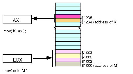 mov( &J, ebx ); // Load address of J into EBX. mov( eax, [ebx] ); // Store EAX into J.Of course, it would have been simpler to store the value in EAX directly into J rather than using two instructions to do this indirectly. However, you can easily imagine a code sequence where the program loads one of several different addresses into EBX prior to the execution of the "mov( eax, [ebx]);" statement, thus storing EAX into one of several different locations depending on the execution path of the program.