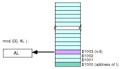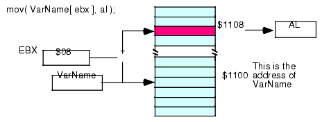 The indexed addressing mode computes an effective address3 by adding the address of the specified variable to the value of the 32-bit register appearing inside the square brackets. This sum is the actual address in memory that the instruction will access. So if VarName is at address $1100 in memory and EBX contains eight, then "mov( VarName[ ebx ], al );" loads the byte at address $1108 into the AL register (see Figure 2.3).