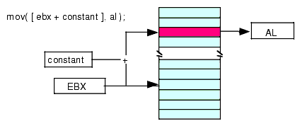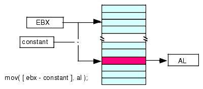 mov( [ ebx + constant ], al ); mov( [ ebx - constant ], al );These examples use only the EBX register. However, you can use any of the other 32-bit general purpose registers in place of EBX. This addressing mode computes its effective address by adding the value in EBX to the specified constant, or subtracting the specified constant from EBX (See Figure 2.4 and Figure 2.5).