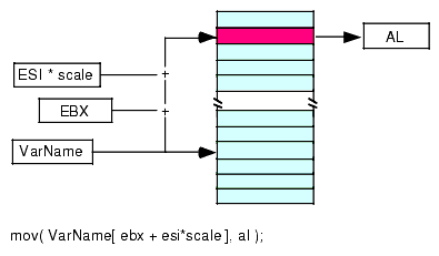 VarName[ IndexReg32*scale ] VarName[ IndexReg32*scale + displacement ] VarName[ IndexReg32*scale - displacement ][ BaseReg32 + IndexReg32*scale ] [ BaseReg32 + IndexReg32*scale + displacement ] [ BaseReg32 + IndexReg32*scale - displacement ]VarName[ BaseReg32 + IndexReg32*scale ] VarName[ BaseReg32 + IndexReg32*scale + displacement ] VarName[ BaseReg32 + IndexReg32*scale - displacement ]In these examples, BaseReg32 represents any general purpose 32-bit register, IndexReg32 represents any general purpose 32-bit register except ESP, and scale must be one of the constants: 1, 2, 4, or 8.