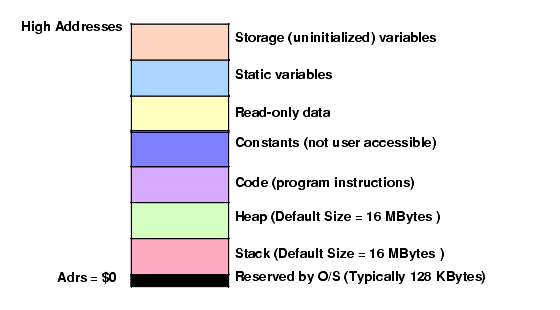 An operating system like Linux or Windows tends to put different types of data into different sections (or segments) of main memory. Although it is possible to reconfigure memory to your choice by running the Linker and specify various parameters, by default Windows loads an HLA program into memory using the following basic organization (Linux is similar, though it rearranges some of the sections):
