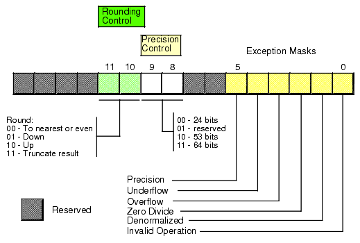 Bits zero through five are the exception masks. These are similar to the interrupt enable bit in the 80x86's flags register. If these bits contain a one, the corresponding condition is ignored by the FPU. However, if any bit contains zero, and the corresponding condition occurs, then the FPU immediately generates an interrupt so the program can handle the degenerate condition.