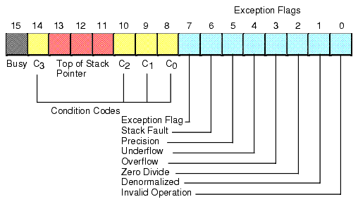 Bits zero through five are the exception flags. These bits are appear in the same order as the exception masks in the control register. If the corresponding condition exists, then the bit is set. These bits are independent of the exception masks in the control register. The FPU sets and clears these bits regardless of the corresponding mask setting.