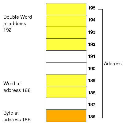 Note that it is quite possible for byte, word, and double word values to overlap in memory. For example, in Figure 1.4 you could have a word variable beginning at address 193, a byte variable at address 194, and a double word value beginning at address 192. These variables would all overlap.