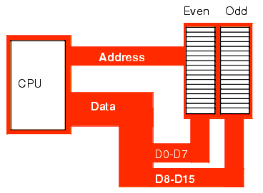 Some older x86 CPUs (e.g., the 8086 and 80286) have a 16 bit data bus. This allows these processors to access twice as much memory in the same amount of time as their eight bit brethren. These processors organize memory into two banks: an "even" bank and an "odd" bank (see Figure 1.6). Figure 1.7 illustrates the connection to the CPU (D0-D7 denotes the L.O. byte of the data bus, D8-D15 denotes the H.O. byte of the data bus):