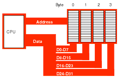 The 80x86 processors with a 32-bit data bus (e.g., the 80386 and 80486) use four banks of memory connected to the 32 bit data bus (see Figure 1.8).