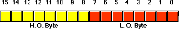 Notice that a word contains exactly two bytes. Bits 0 through 7 form the low order byte, bits 8 through 15 form the high order byte: