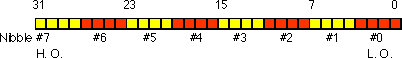 Naturally, this double word can be divided into a high order word and a low order word, or four different bytes, or eight different nibbles: