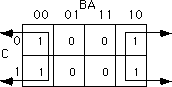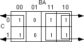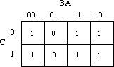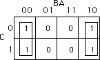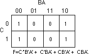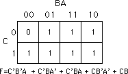 = C'B'A' + C'BA' + CB'A' + C'AB + CBA' + CBA. This produces the truth map appearing