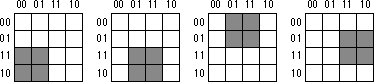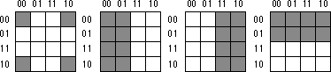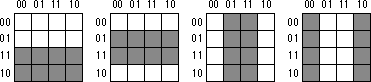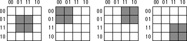 Truth maps you create for functions of four variables are even trickier. This is because there are lots of places rectangles can hide from you along the edges. The Figures below show some possible places rectangles can hide.