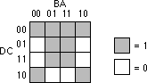 + D'C'BA' + D'CB'A + D'CBA + DCB'A + DCBA + DC'B'A' + DC'BA', the truth map appears