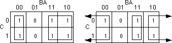 The next step is to draw rectangles around rectangular groups of ones. The rectangles you enclose must have sides whose lengths are powers of two. For functions of three variables, the rectangles can have sides whose lengths are one, two, and four. The set of rectangles you draw must surround all cells containing ones in the truth map. The trick is to draw all possible rectangles unless a rectangle would be completely enclosed within another. Note that the rectangles may overlap if one does not enclose the other. In the truth map below there are three such rectangles:
