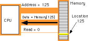 To execute the equivalent of "CPU := Memory [125];" the CPU places the address 125 on the address bus, asserts the read line (since the CPU is reading data from memory), and then reads the resulting data from the data bus: