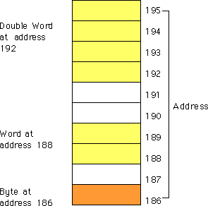 Note that it is quite possible for byte, word, and double word values to overlap in memory. For example, in the figure below you could have a word variable beginning at address 193, a byte variable at address 194, and a double word value beginning at address 192. These variables would all overlap.