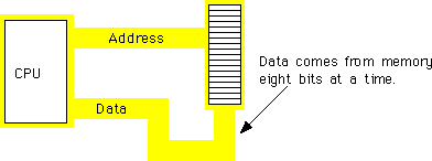 The 8088 and 80188 microprocessors have an eight bit data bus. This means that the CPU can transfer eight bits of data at a time. Since each memory address corresponds to an eight bit byte, this turns out to be the most convenient arrangement (from the hardware perspective), see Figure 3.5, below: