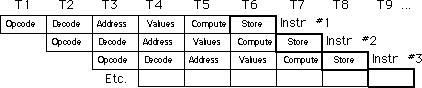 The figure below, Instruction Execution in a Pipeline, demonstrates pipelining. T1, T2, T3, etc., represent consecutive "ticks" of the system clock. At T=T1 the CPU fetches the opcode byte for the first instruction.