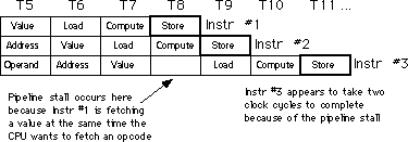 One simplistic way to handle bus contention is through a pipeline stall. The CPU, when faced with contention for the bus, gives priority to the instruction furthest along in the pipeline. The CPU suspends fetching opcodes until the current instruction fetches (or stores) its operand. This causes the new instruction in the pipeline to take two cycles to execute rather than one: