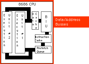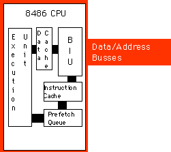 Each path inside the CPU represents an independent bus. Data can flow on all paths concurrently. This means that the prefetch queue can be pulling instruction opcodes from the instruction cache while the execution unit is writing data to the data cache. Now the BIU only fetches opcodes from memory whenever it cannot locate them in the instruction cache. Likewise, the data cache buffers memory. The CPU uses the data/address bus only when reading a value which is not in the cache or when flushing data back to main memory.
