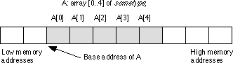 The base address of an array is the address of the first element on the array and always appears in the lowest memory location. The second array element directly follows the first in memory, the third element follows the second, etc. Note that there is no requirement that the indices start at zero. They may start with any number as long as they are contiguous. However, for the purposes of discussion, it's easier to discuss accessing array elements if the first index is zero. This text generally begins most arrays at index zero unless there is a good reason to do otherwise. However, this is for consistency only. There is no efficiency benefit one way or another to starting the array index at some value other than zero.