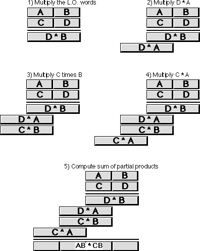 The 80x86 does extended precision multiplication in the same manner except that it works with bytes, words, and double words rather than digits. The figure below shows how this works.