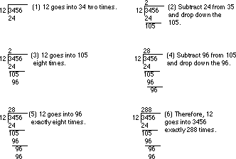 As for multiplication, the best way to understand how the computer performs division is to study how you were taught to perform long division by hand. Consider the operation 3456/12 and the steps you would take to manually perform this operation: