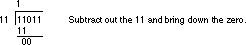 This algorithm is actually easier in binary since at each step you do not have to guess how many times 12 goes into the remainder nor do you have to multiply 12 by your guess to obtain the amount to subtract. At each step in the binary algorithm the divisor goes into the remainder exactly zero or one times. As an example, consider the division of 27 (11011) by three (11):