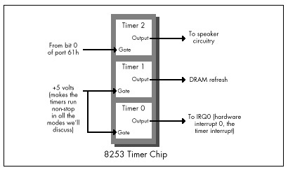 Timer 2 drives the speaker, although it can be used for other timing purposes when the speaker is not in use. As shown in Figure 3.1, timer 2 is the only timer with a programmable gate input in the PC; that is, timer 2 is the only timer that can be started and stopped under program control in the manner specified by Intel. On the other hand, the output of timer 2 is connected to nothing other than the speaker. In particular, timer 2 cannot generate an interrupt to get the 8088s attention.
